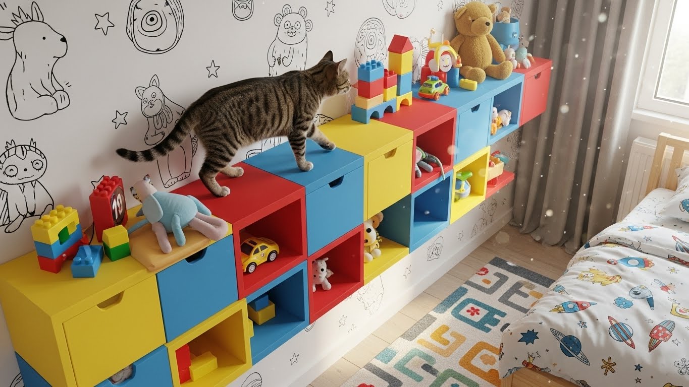 A storage bench serves dual purposes: organizing kids’ toys and storing cat supplies like brushes, toys, or treats. This keeps the room tidy and teaches kids responsibility.