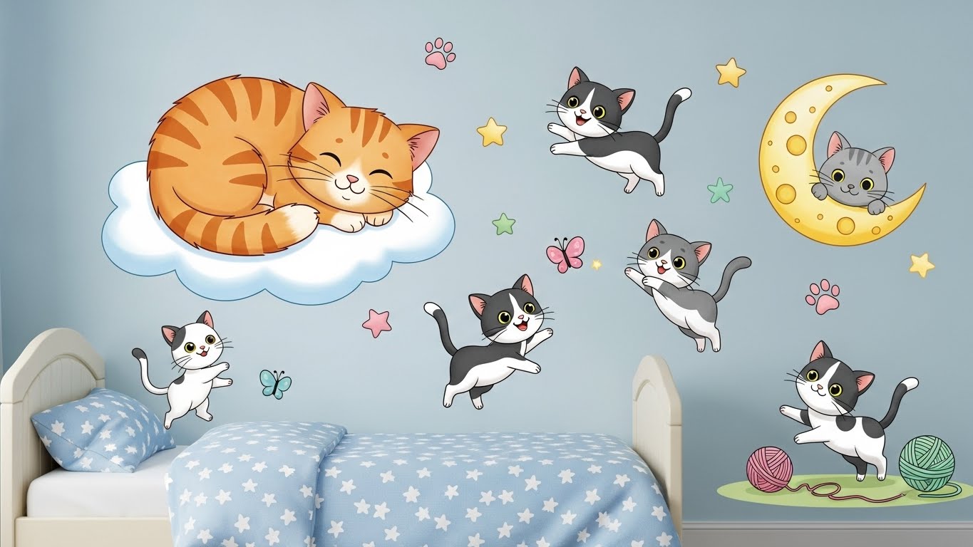 Wall decals and artwork are an easy way to personalize a kids’ bedroom without permanent changes. Choose playful cat illustrations, paw prints, or name decals.