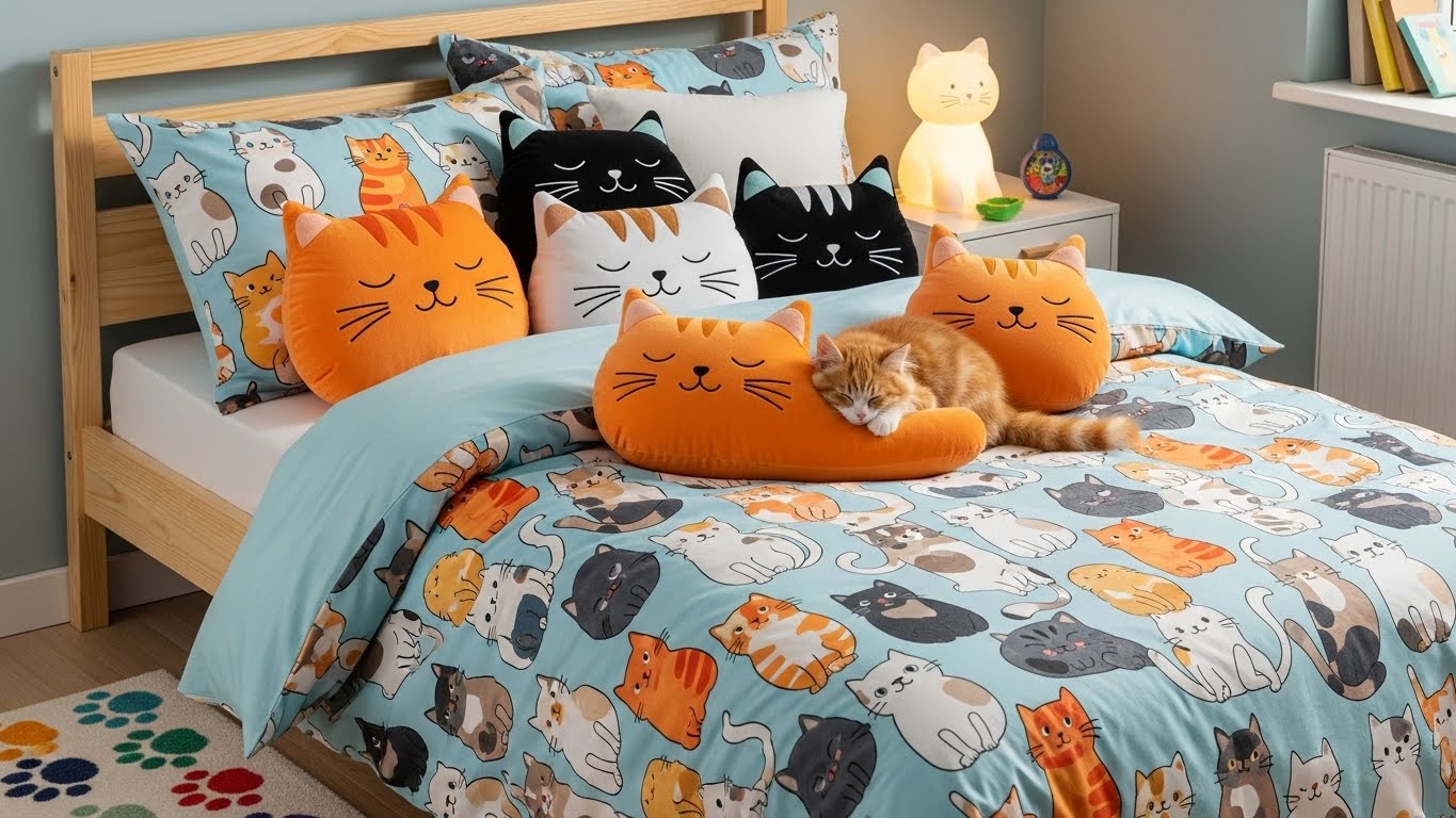 One of the simplest ways to create an adorable cat bedroom is through themed bedding. Cat-print sheets, pillows shaped like paws, and soft blankets instantly set a playful tone.