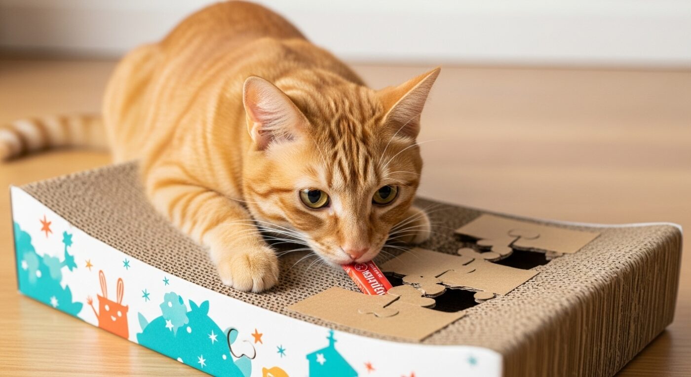 Combine scratching with play and feeding by creating a puzzle scratcher. Cut small openings in cardboard layers and hide treats or toys inside. As your cat scratches, climbs, or bats the cardboard, it discovers hidden treasures.