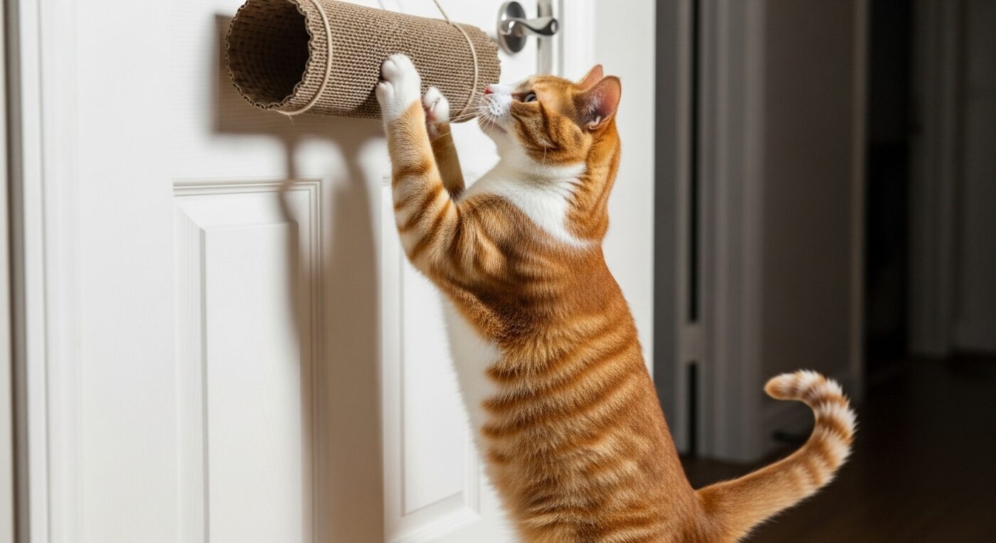 Maximize small spaces with a hanging scratcher that attaches to doors or walls. Use a small piece of cardboard or fabric and hang it with sturdy string. Cats love swinging or batting objects with their paws, and this option doubles as both a toy and scratcher.
