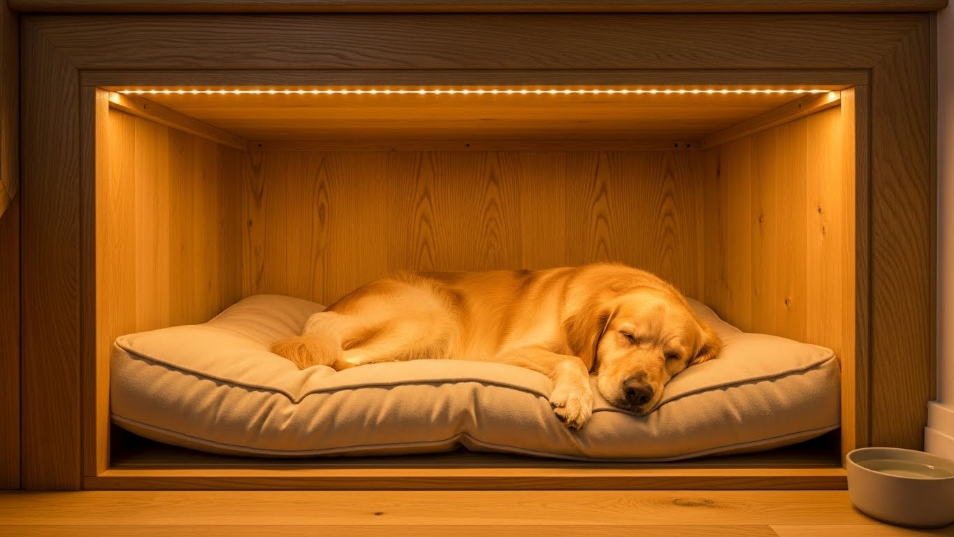 Soft, warm lighting can make the space feel calming, especially at night, without disturbing your dog’s sleep. This idea is ideal for urban apartments or contemporary houses where every design element matters.