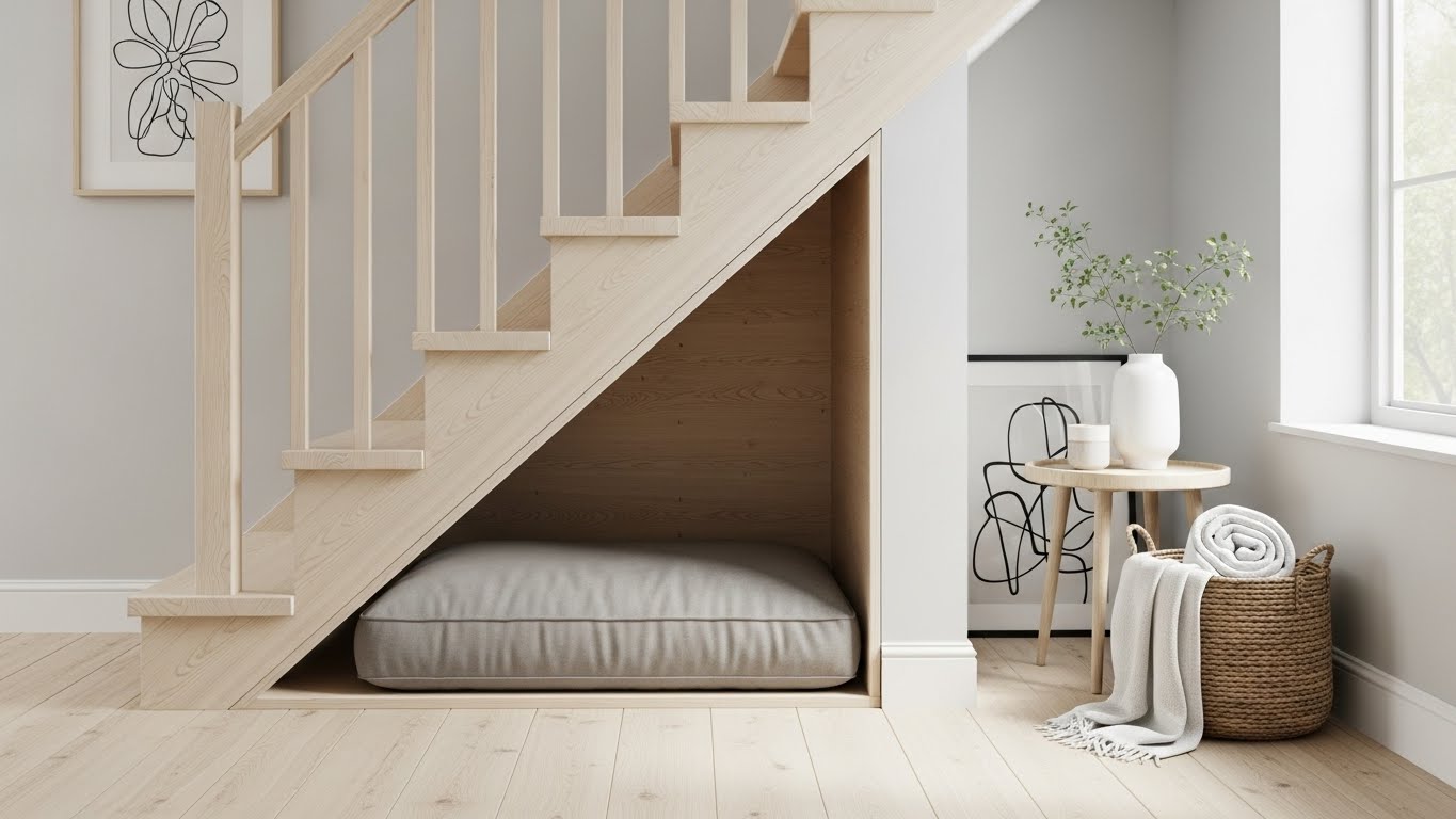 9. Scandinavian-Inspired Under Stairs Dog Bed