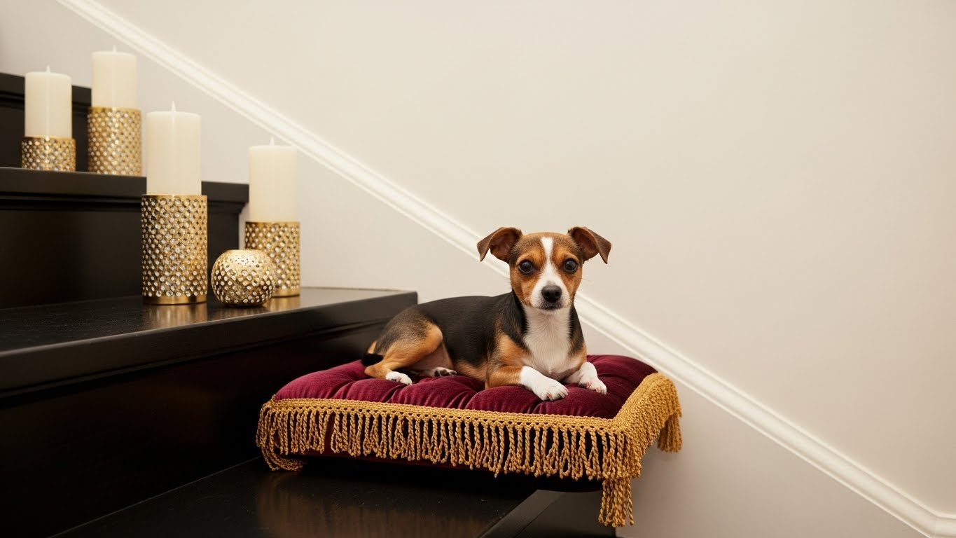Pairing rich textures with muted colors like emerald, navy, or taupe can transform the under-stair area into a boutique-style dog suite.