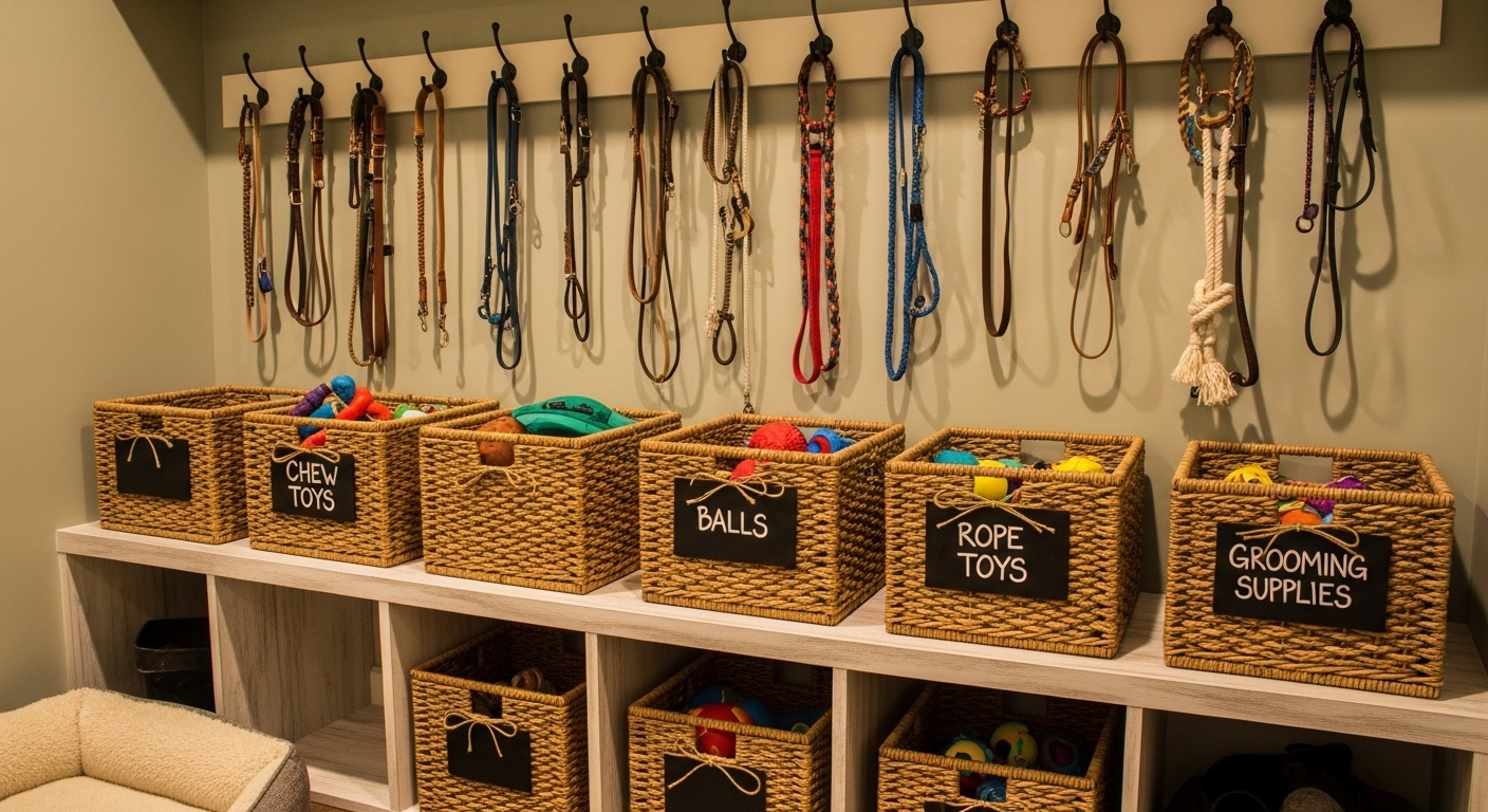 Keeping all your dog essentials in one place reduces clutter and keeps the mud room functional. Built-in cubbies, hooks, and baskets allow you to store leashes, collars, harnesses, toys, and cleaning supplies.