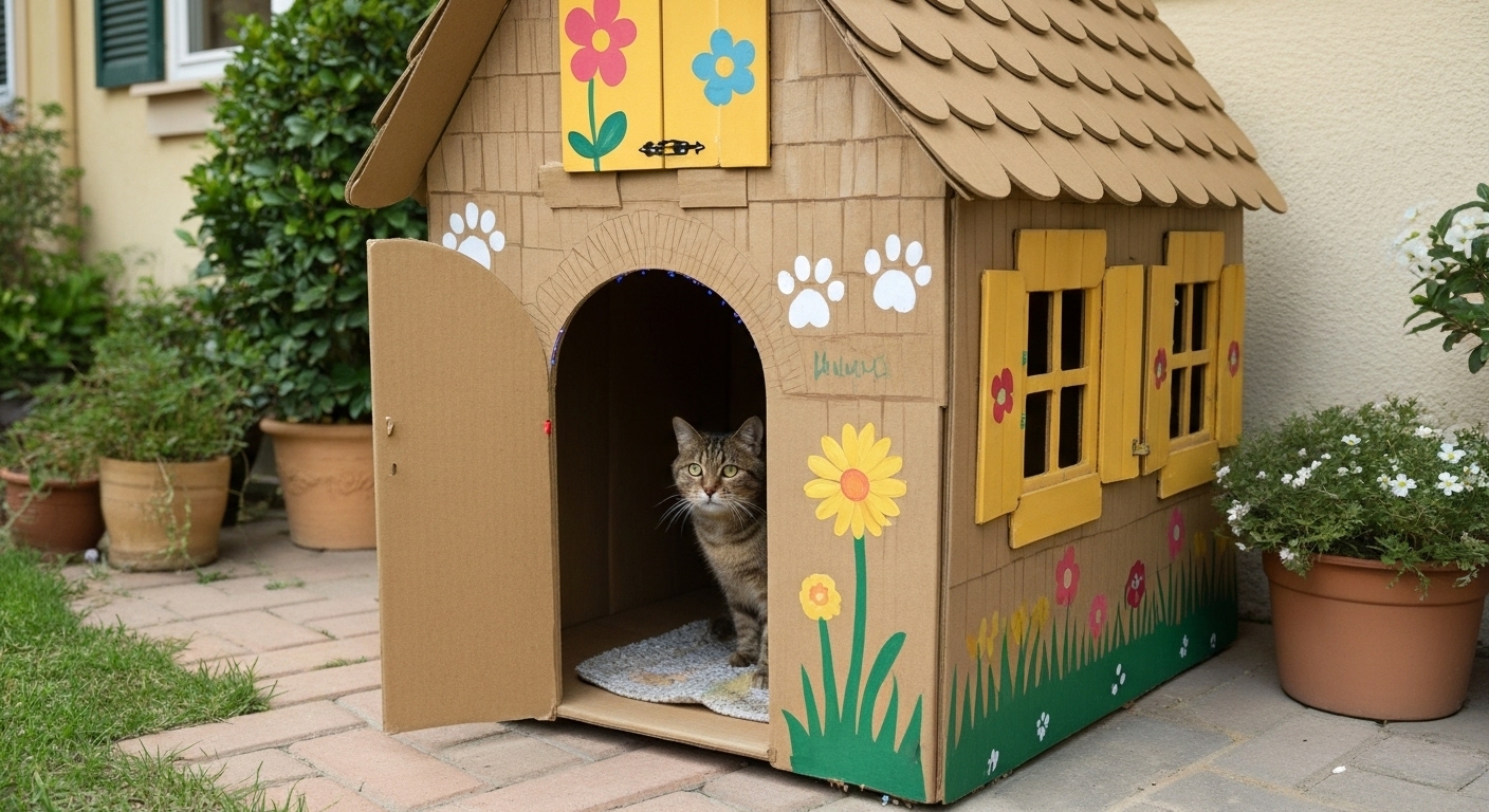 DIY Cat House: Cardboard Bungalow with Painted Windows