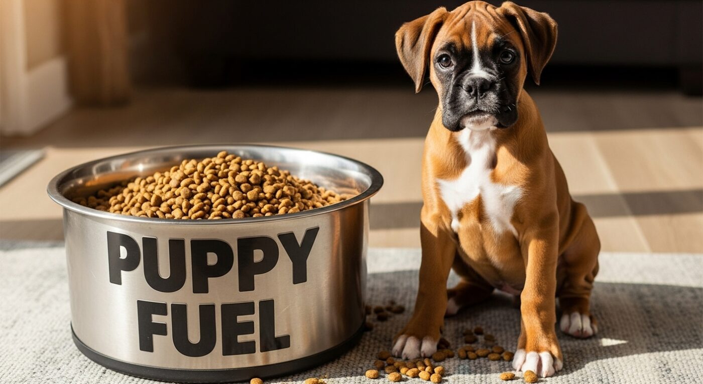(Pinterest Idea: Boxer puppy sitting beside a large food bowl labeled “Puppy Fuel.”)