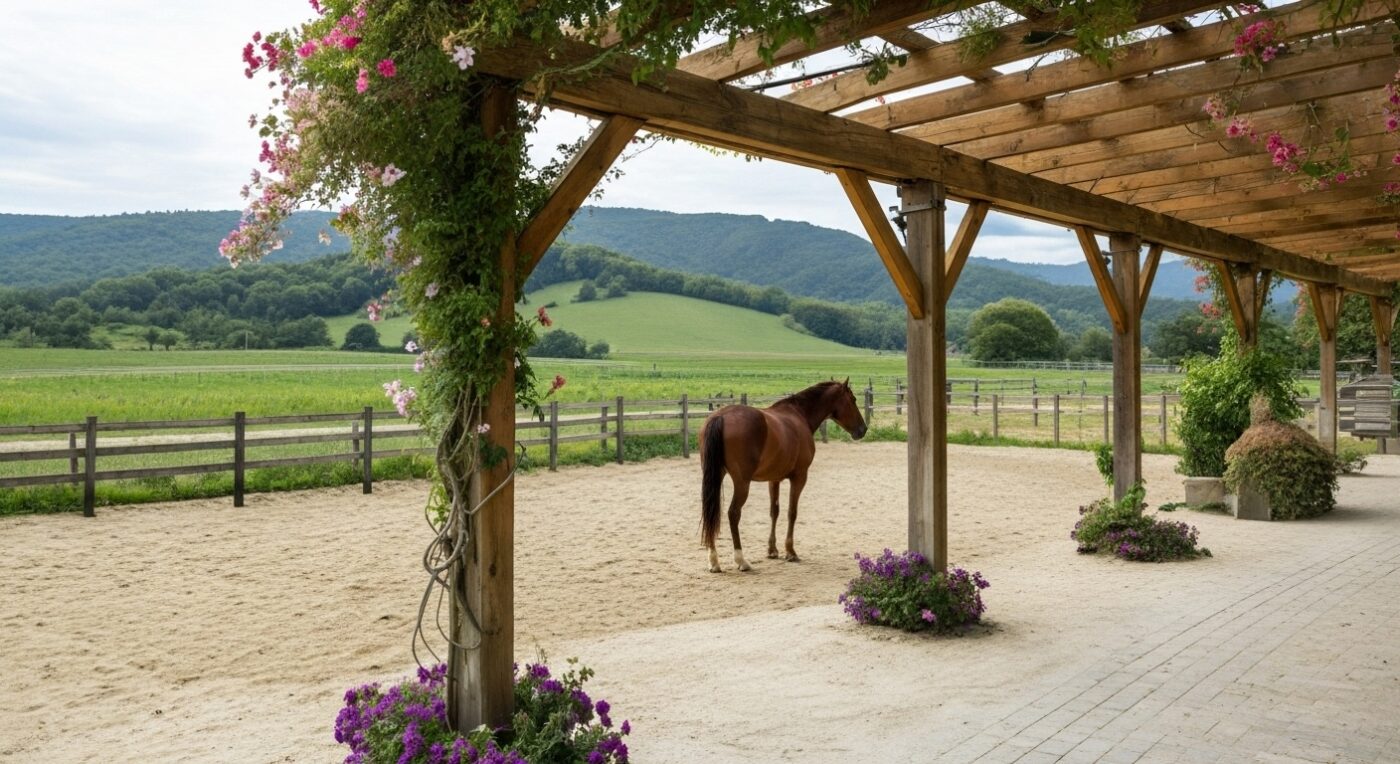 A natural wooden pergola adds both elegance and functionality to a horse shelter, providing shade and a calming environment. By adorning it with climbing plants such as wisteria or jasmine, you create a serene space where horses can relax and enjoy their surroundings. The dappled sunlight filtering through the foliage not only enhances the visual appeal but also offers a natural cooling effect on hot days. This enchanting addition elevates the overall atmosphere of your equine area while supporting the well-being and comfort of your animals.