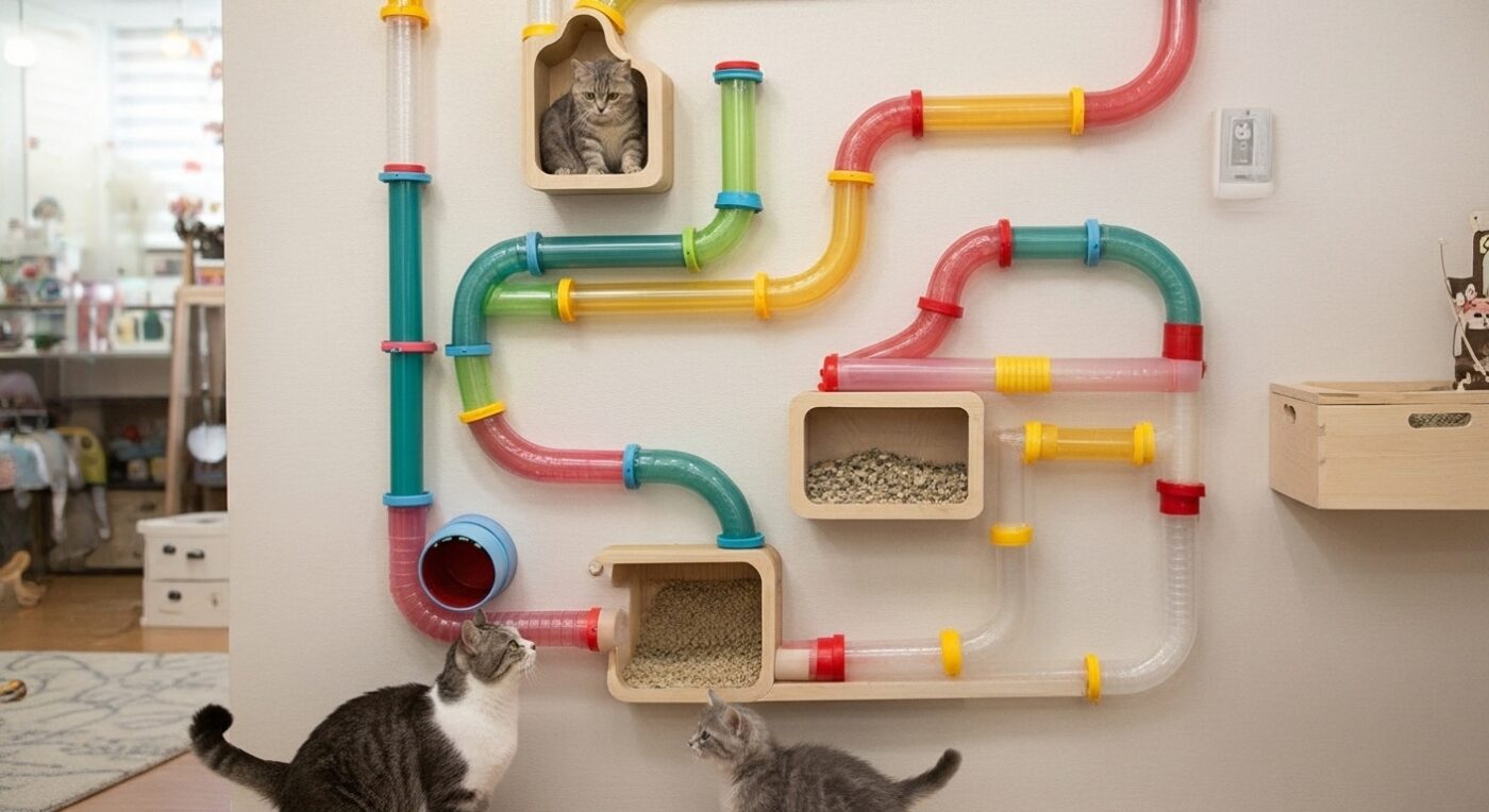 Turn any mini cat room into an adventurous playground with an interactive wall maze featuring tunnels. This innovative setup allows cats to climb, explore, and navigate through interconnected pathways and hidden openings, satisfying their natural curiosity and instinctive hunting behavior. By encouraging physical exercise and mental stimulation, the wall maze helps reduce boredom and keeps indoor cats happy and healthy. Its wall-mounted design makes the most of limited space, transforming ordinary rooms into exciting, feline-friendly environments that your cat will love.