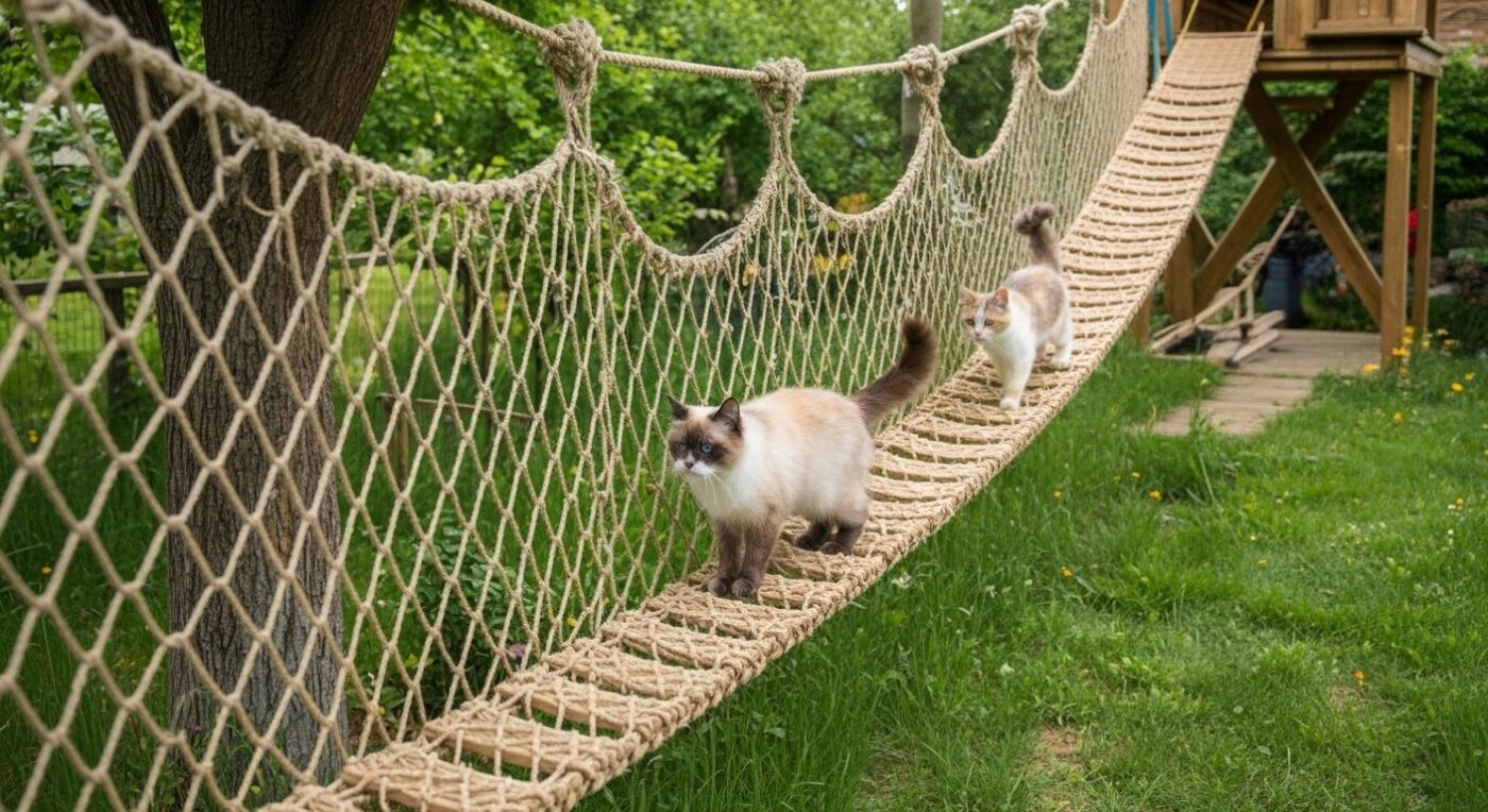 Suspended rope bridges bring excitement and adventure to any outdoor cat playground, offering daring kitties the thrill of exploring at elevated heights. These bridges connect platforms safely, encouraging cats to climb, balance, and navigate while satisfying their natural instincts for exploration.