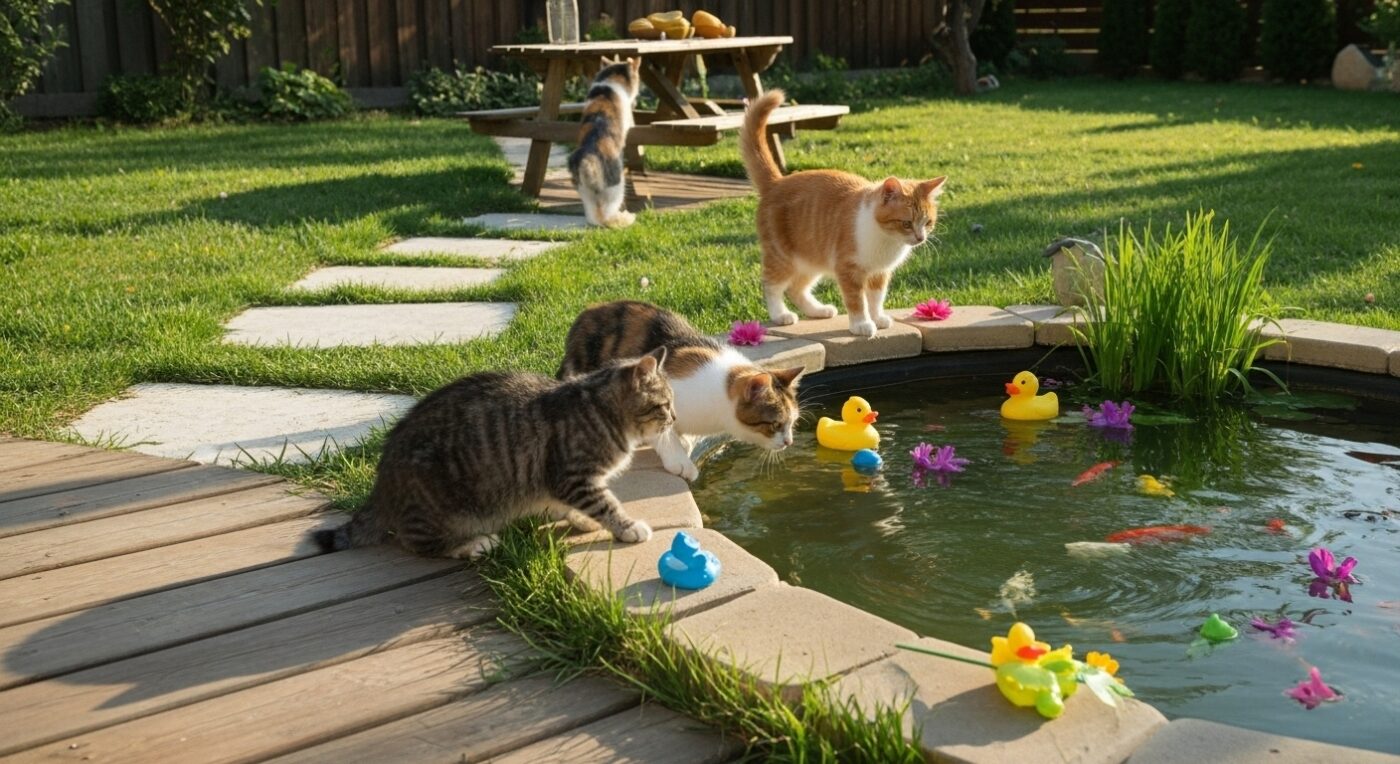 A mini pond with floating toys can be a charming and engaging addition to your outdoor cat playground. Shallow water combined with floating items—like colorful rubber fish or small boats—invites cats to bat, chase, and interact, providing both physical exercise and mental stimulation.